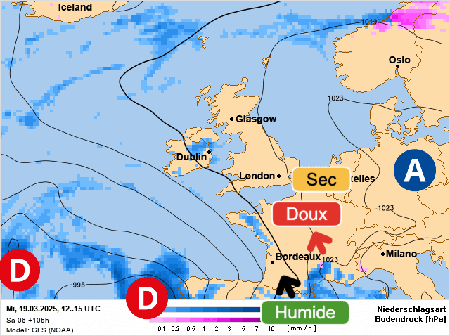Le régime dépressionnaire devrait regagner en activité sur l'Atlantique, gagnant la bataille sur l'Ouest de l'Europe. Un flux perturbé humide mais doux (de saison) de Sud-Sud-Ouest se mettrait alors en place.
