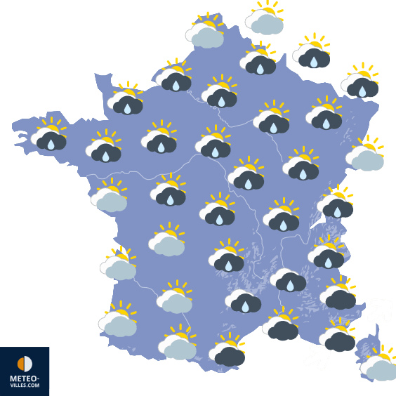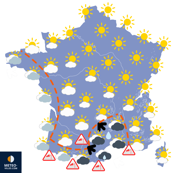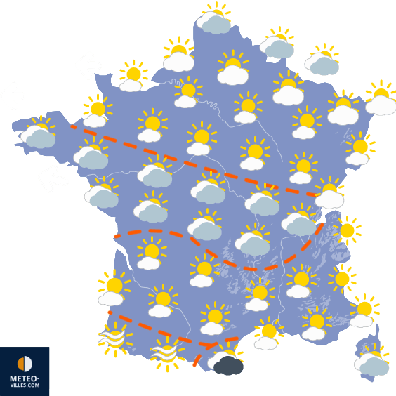 Le Soleil devrait largement dominer avec des températures agréables, sauf près de la Méditerranée où le vent marin donnera un ciel très nuageux avec quelques pluies et de la fraîcheur.