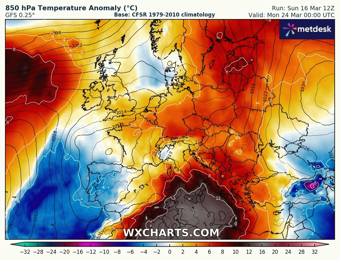 Évolution des anomalies de températures de la masse d'air à 1500m du 24 mars au 1er avril - WXCharts