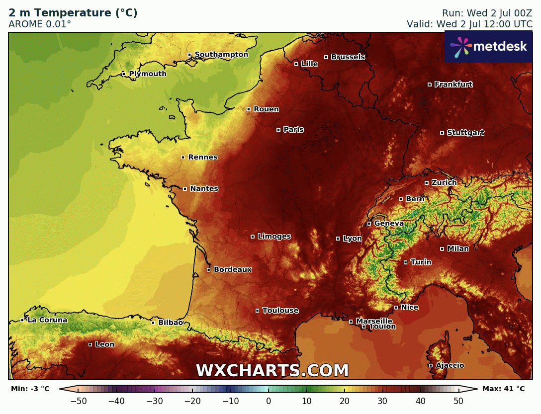 La canicule commence à reculer ce mercredi 2 juillet 2025 avec une baisse des températures par le nord et l'ouest. Après des valeurs qui atteindront encore 35 à 39°C dans les régions du centre et de l'est en après-midi, le flux de nord-ouest va s'accélérer et amener un rafraîchissement bienvenu en soirée sur un grand quart nord-ouest de l'hexagone, où la nuit de mercredi à jeudi deviendra bien fraîche (10-15°C) comme le montre l'animation ci-dessous. En revanche, on voit bien que ce rafraîchissement ne gagnera pas vraiment le sud et le flanc est.