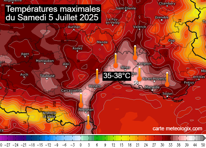 Températures maximales du samedi 5 juillet 2025 en Méditerranée - meteologix.com