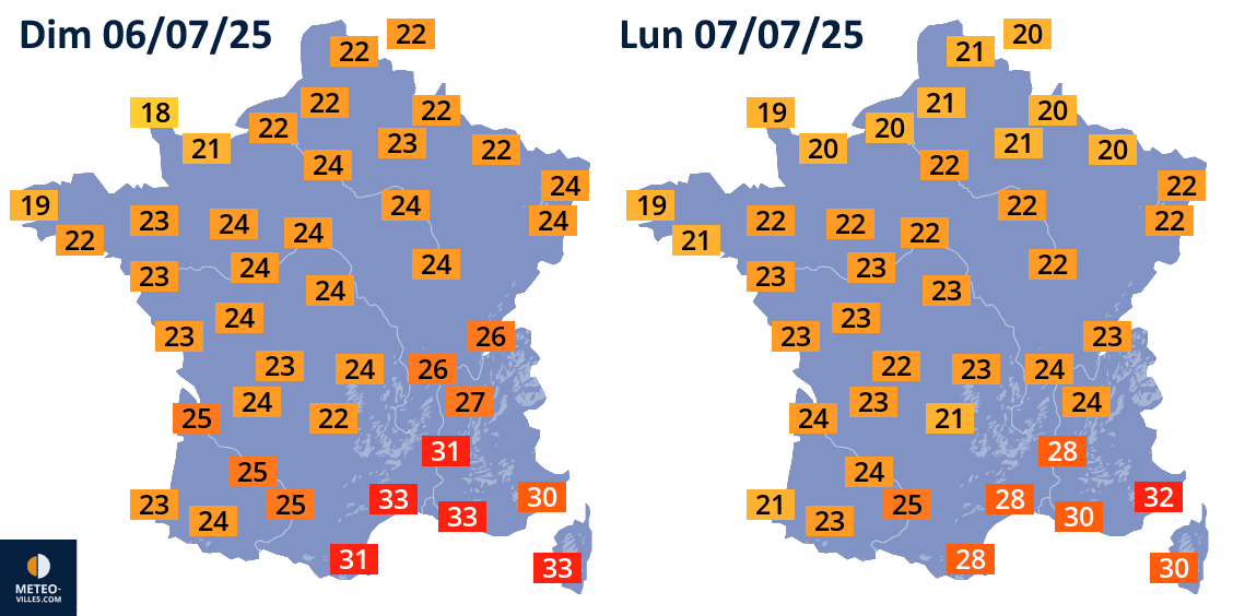 Températures maximales prévues les dimanche 6 et lundi 7 juillet 2025 - Météo Villes