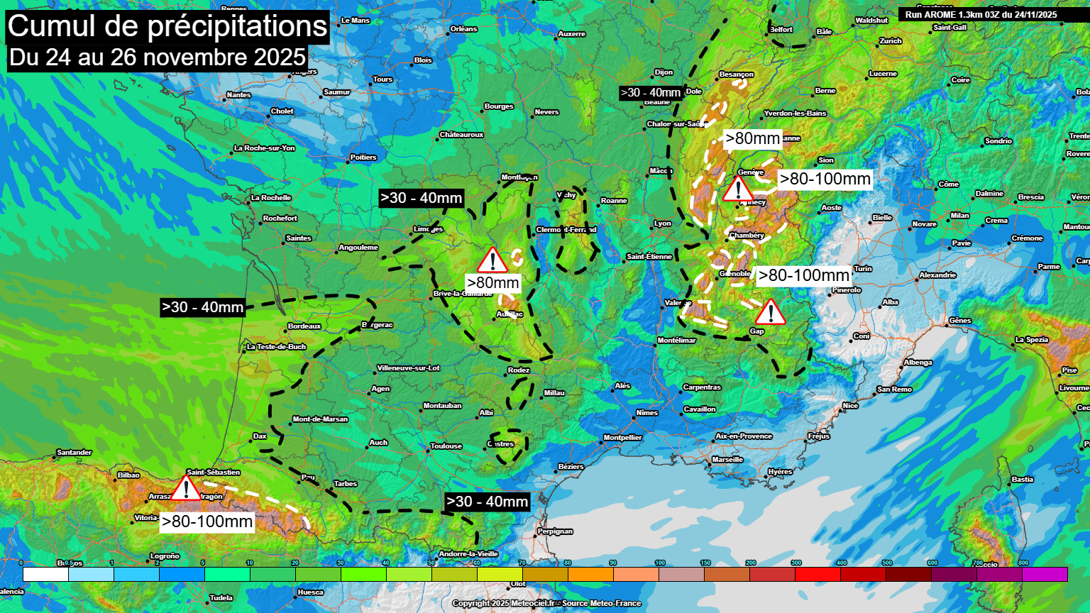 Cumuls de précipitations prévus sur la France jusqu'au mercredi 26 novembre au matin – arome via meteociel.fr