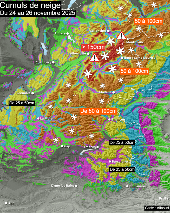 Cumuls de neige attendus sur le Nord et le Sud des Alpes jusqu'au mercredi 26 novembre 2025 – Via Allosurf