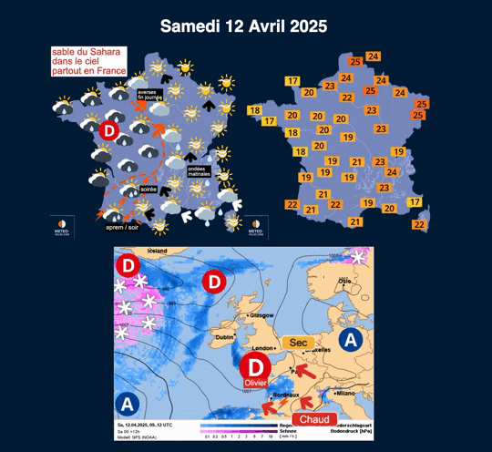 Évolution du temps prévue jusqu'au week-end prochain (prévisions METEO-VILLES de samedi 12 avril). Consulter les toutes derniers cartes ici >>>