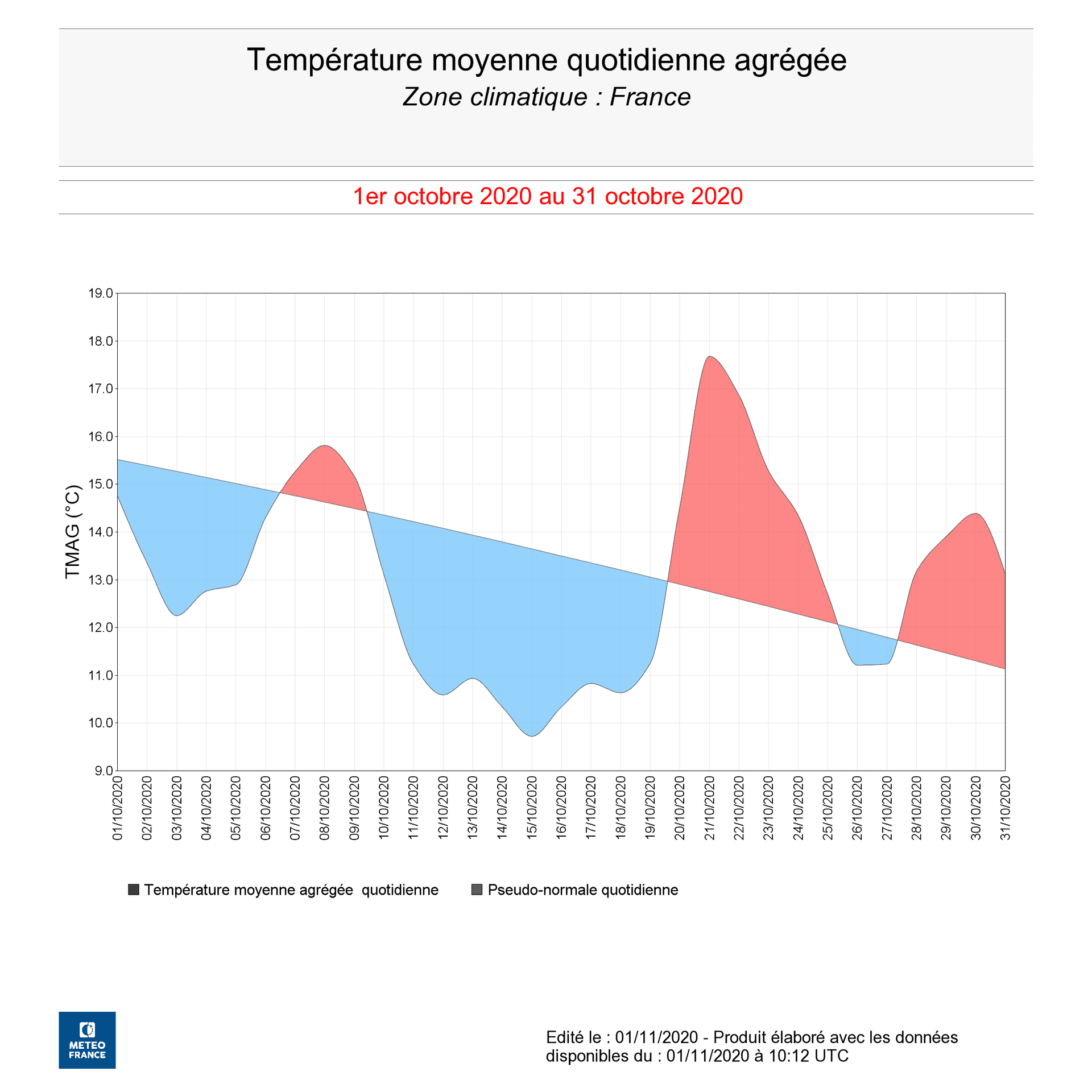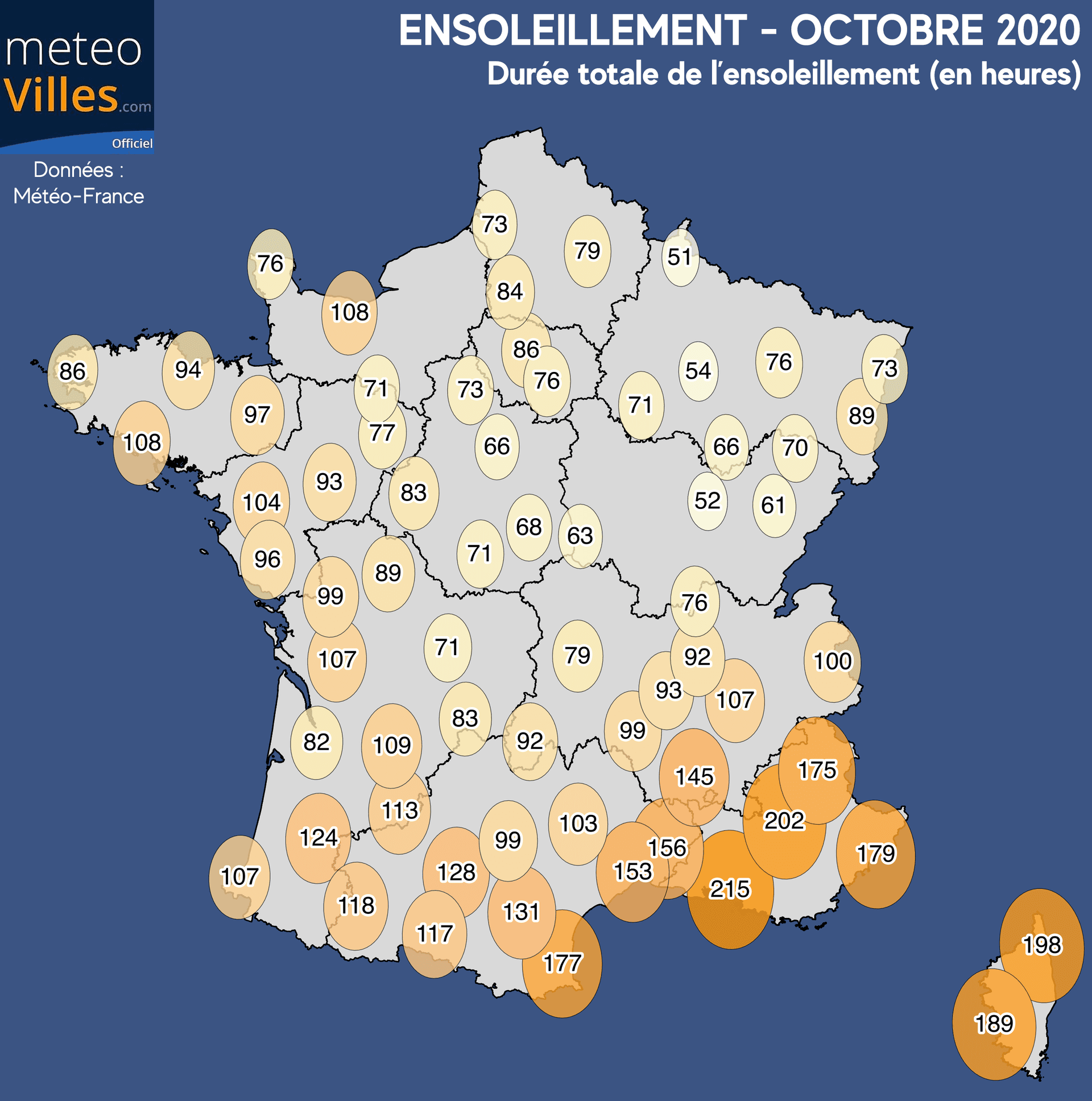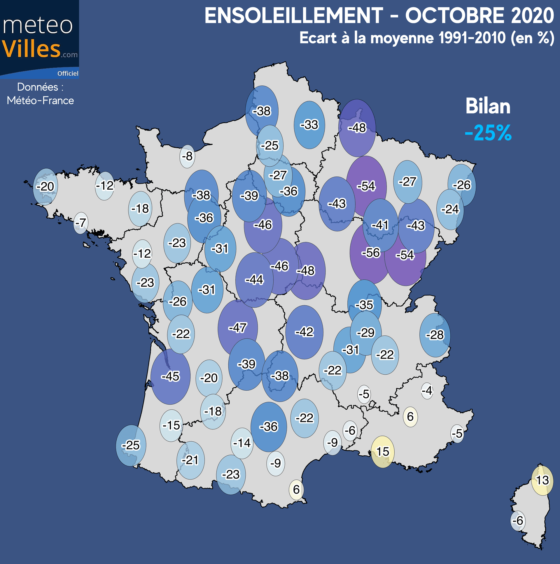 Comme à chaque début de mois, nous vous proposons un bilan climatologique du mois écoulé. Place donc au bilan cartographié du mois de OCTOBRE 2020 en terme de température, pluviométrie et ensoleillement sur un panel de 73 stations*.