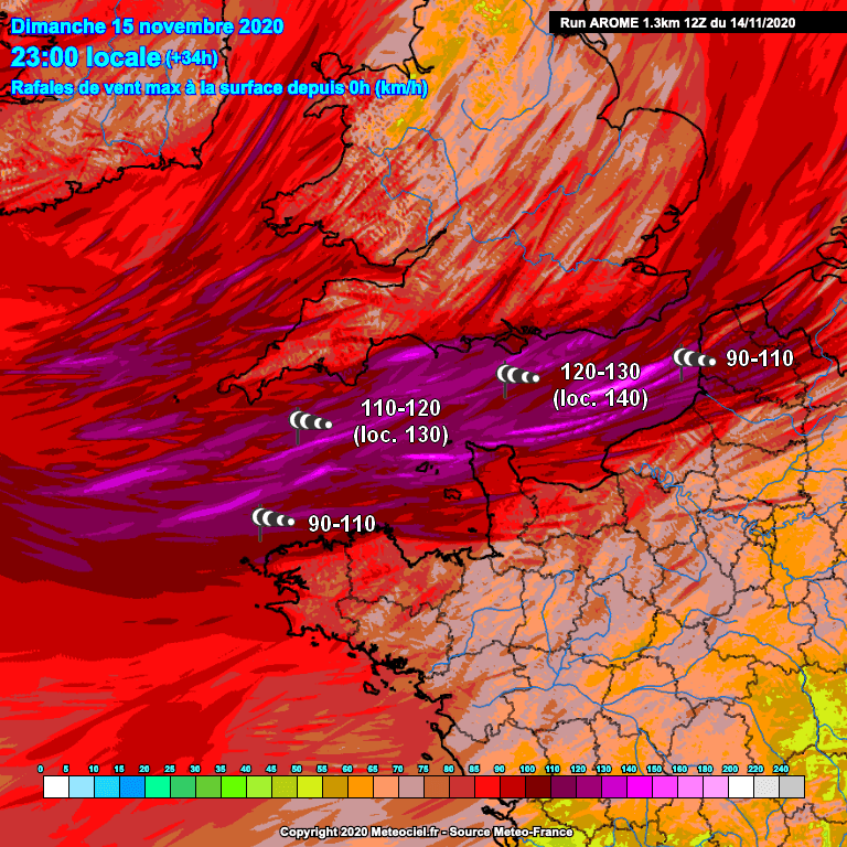 Rafales maximales prévues - dimanche 15 novembre 2020 - Modèle Arome via Météociel