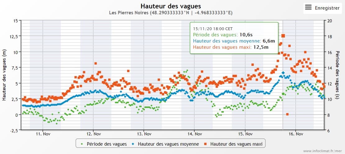 Hauteur maximale de vague relevée à la bouée de Pierres-Noires (large du Finistère) le 15 Novembre - Via infoclimat.fr