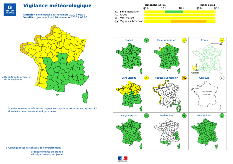 Carte de vigilance émise le 15 Novembre 2020 à 06h00 - Météo-France