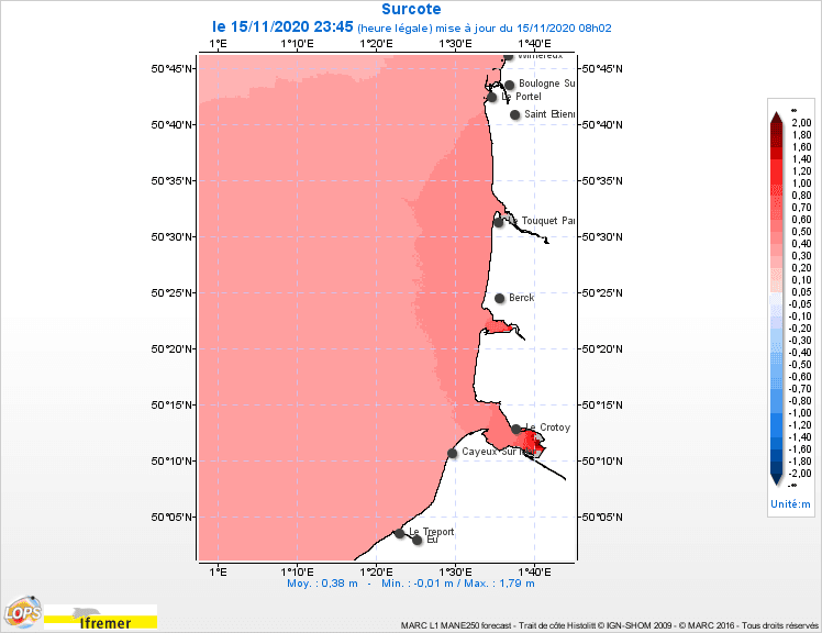 Surcote à la pleine mer en Côte d'Opale - début de nuit du dimanche 15 au lundi 16 novembre 2020 - Ifremer