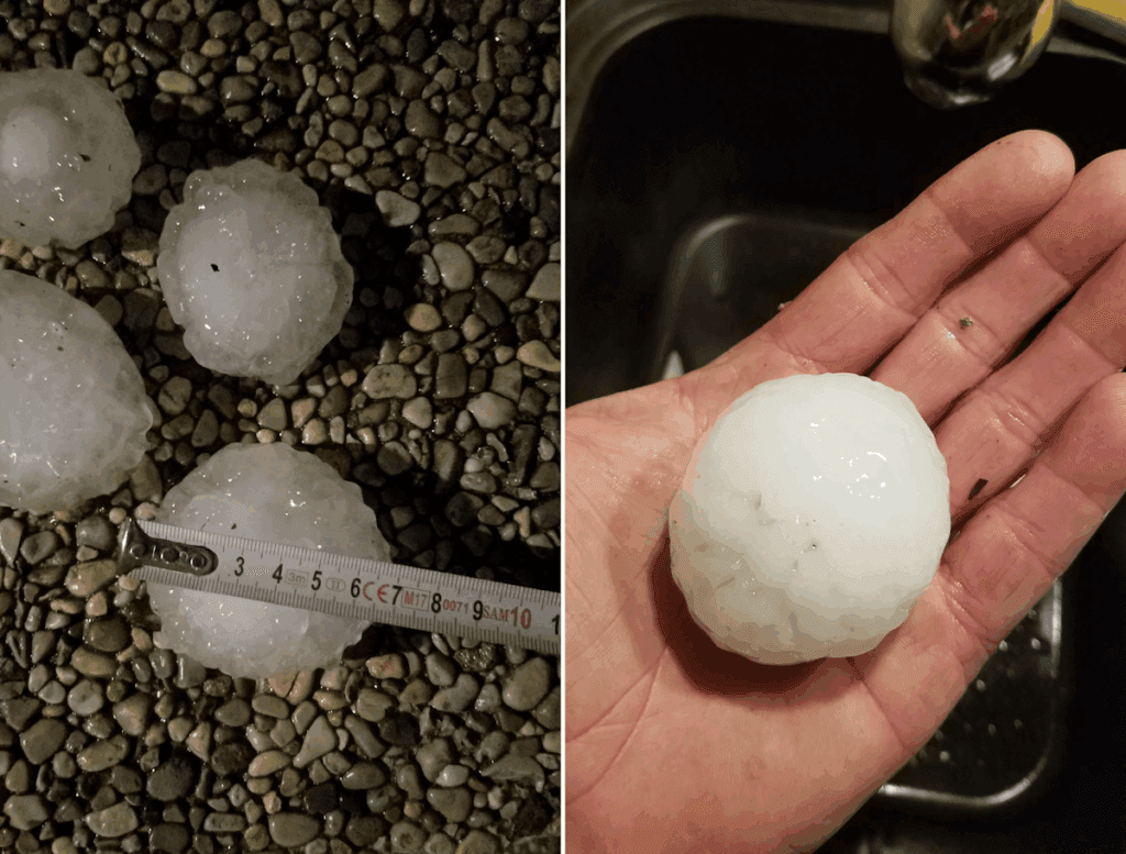 Grêlons de puis plus de 8cm de diamètre dans l'est du Puy-de-Dôme suite au passage de l'orage supercellulaire - Photos : Huguette Epêche et Gérard Goutte