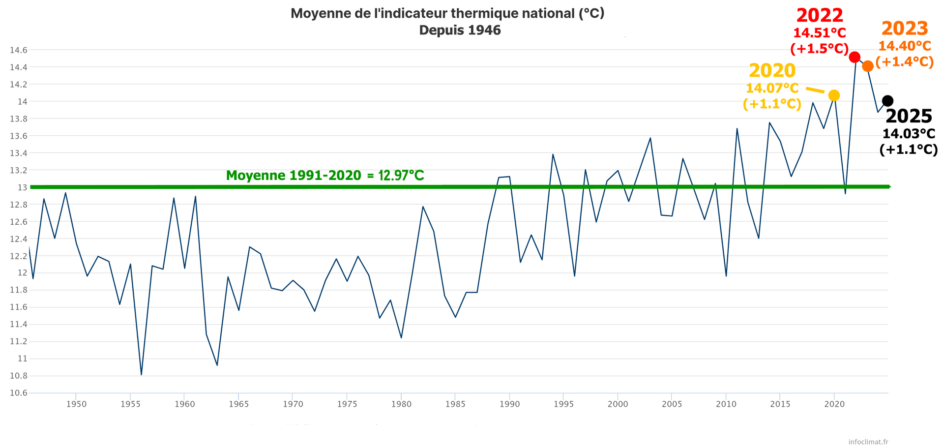 Les 6 années les plus chaudes en France ont été observées au cours des 8 dernières années (2018, 2020, 2022, 2023, 2024 et 2025). Le record reste détenu par l'année 2022 (14.51°C, anomalie de +1.54°C).