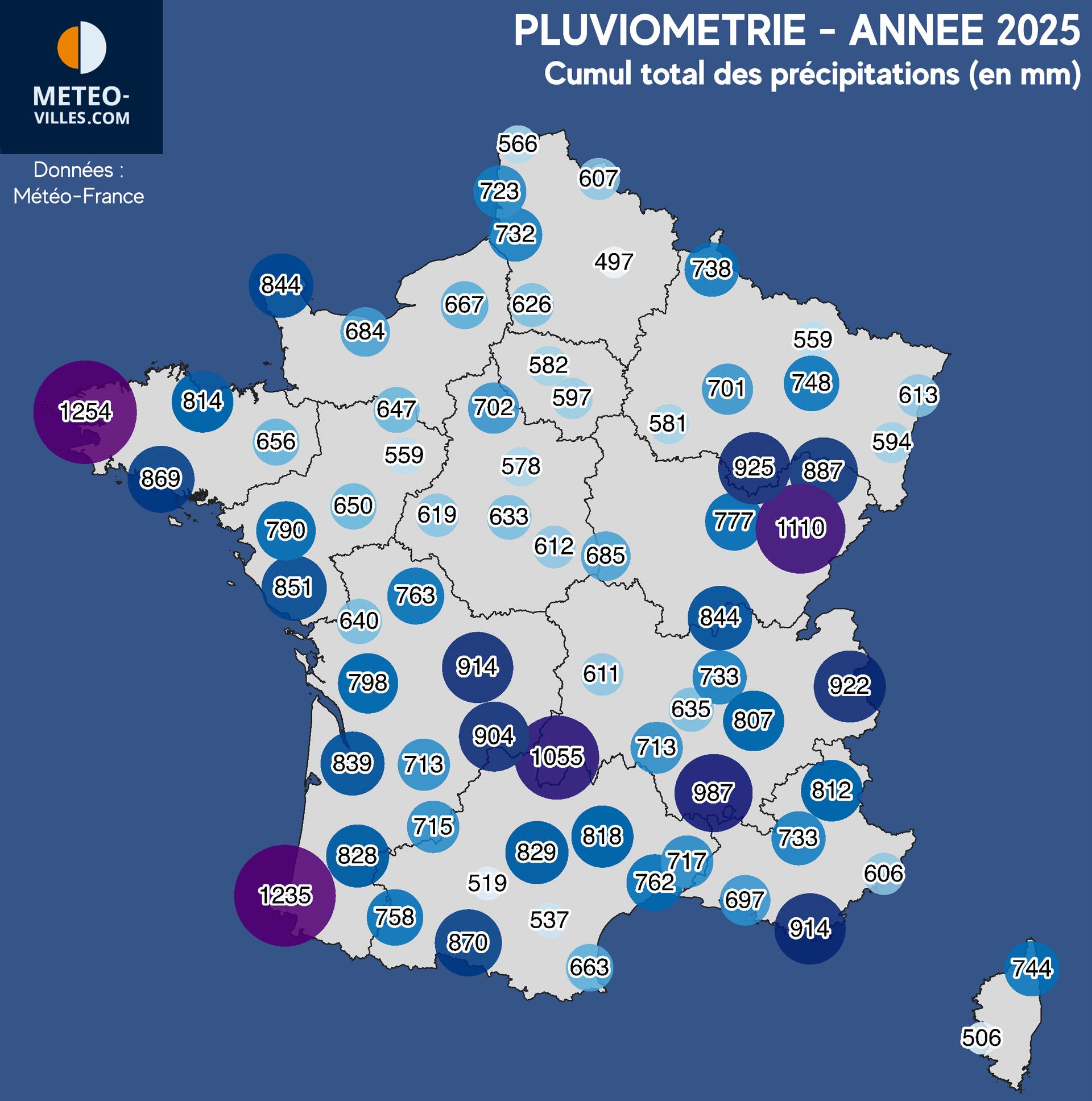 Sur notre panel, il est fréquent de voir Brest et Biarritz aux avants-postes. L'année 2025 n'y échappe pas, mais Brest remporte la palme de la ville la plus arrosée de notre panel avec un cumul total en 2025 de 1254mm, Biarritz suivant de près avec ses 1235mm.