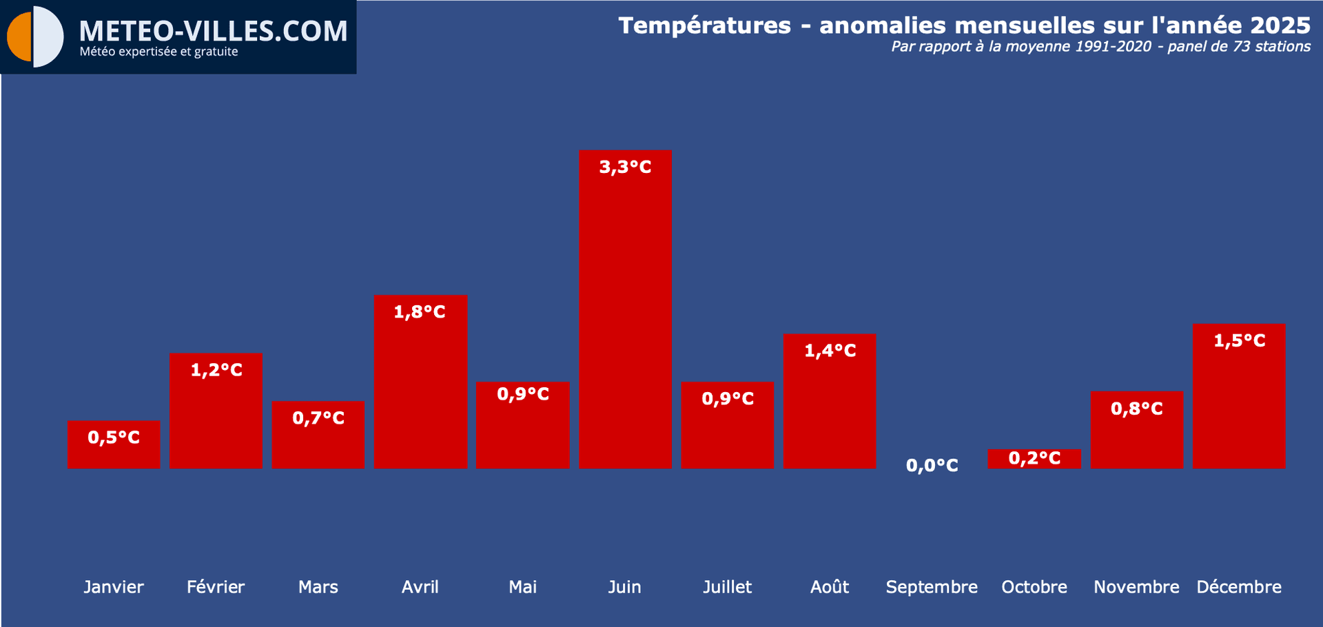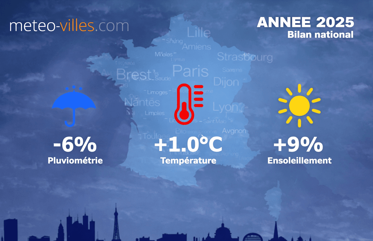 Toute l'équipe de Météo-Villes vous souhaite une très bonne année 2026 ! Et pour débuter cette nouvelle année, il est l'heure de faire les comptes de l'année écoulée. Place donc au bilan météorologique et climatique complet de cette ANNÉE 2025 en termes de température, pluviométrie et ensoleillement sur un panel de 73 stations, (par rapport à la moyenne climatique de référence 1991-2020)*.