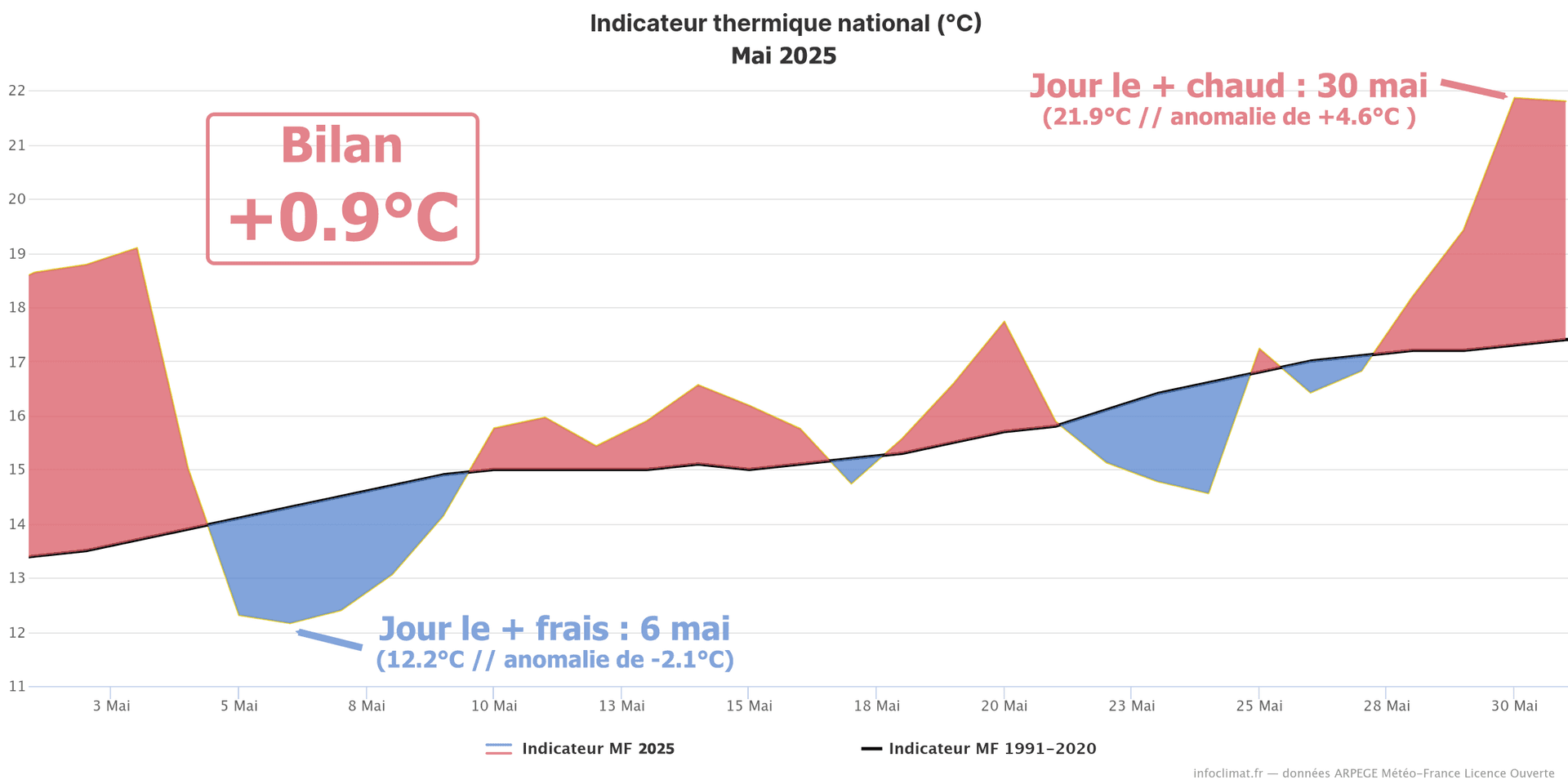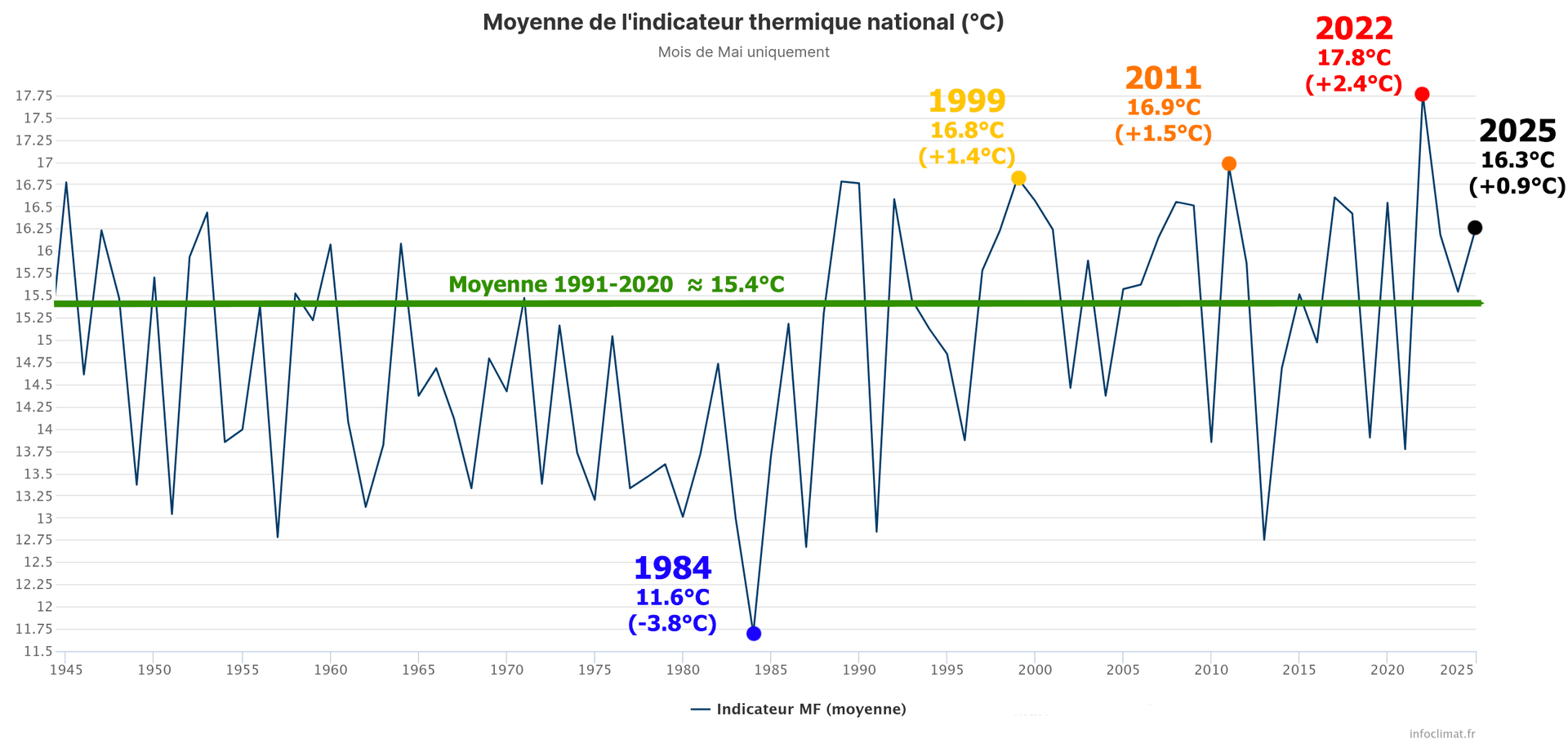 Indicateur thermique national pour mai 2025 depuis l'après-guerre (1945) - Infoclimat
