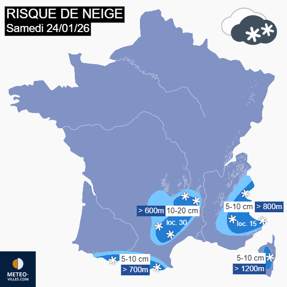 De nouvelles précipitations actives vont toucher le sud de la France ce samedi 24 janvier 2026, remontant notamment de Méditerranée. Ainsi, des chutes de neige parfois abondantes vont concerner les reliefs méridionaux du pays. On attend 10 à 20 cm dans les Cévennes voire localement 30 cm avec une limite pluie/neige s'abaissant vers 600 mètres par effet s'isothermie. Elle descendra vers 800 mètres dans le sud des Alpes où on attend 5 à 10 cm, parfois 15 cm dans les Alpes-Maritimes. Du côté des Pyrénées, 5 à 10 cm tomberont au dessus de 700 mètres. Les mêmes quantités sont prévues en Corse au dessus de 1200 mètres.
