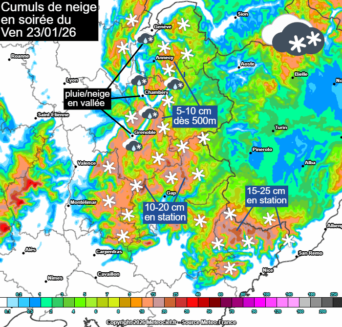 Dès la fin d'après-midi, une perturbation gagnera les pré-Alpes. Elle s'enfoncera sur la chaîne alpine en soirée. Par effet d'isothermie, les températures vont chuter et la neige va descendre rapidement de 1000 vers 500 mètres, voire ponctuellement autour de 300-400 mètres sous les intensités les plus notables. Dans le fond des vallées (Grenoble, Chambéry ou Genève), la neige sera souvent mêlée de pluie et aura du mal à tenir. En revanche, une couche de 3 à 5 cm pourra se former sur Annecy (voire plus sur les hauts de la ville). On attend souvent 5 à 10 cm vers 500 mètres et 10 à 20 cm dans les stations (moins dans les massifs frontaliers). Comme il s'agira d'une neige lourde et collante, elle tiendra aisément et rendra les chaussées glissantes jusque sur les autoroutes de la région.