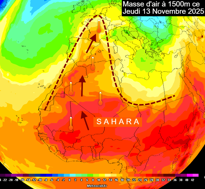 Masse d'air à 850 hPa (vers 1500m) ce jeudi 13 novembre 2025, venue directement du Sahara ! - meteociel.fr