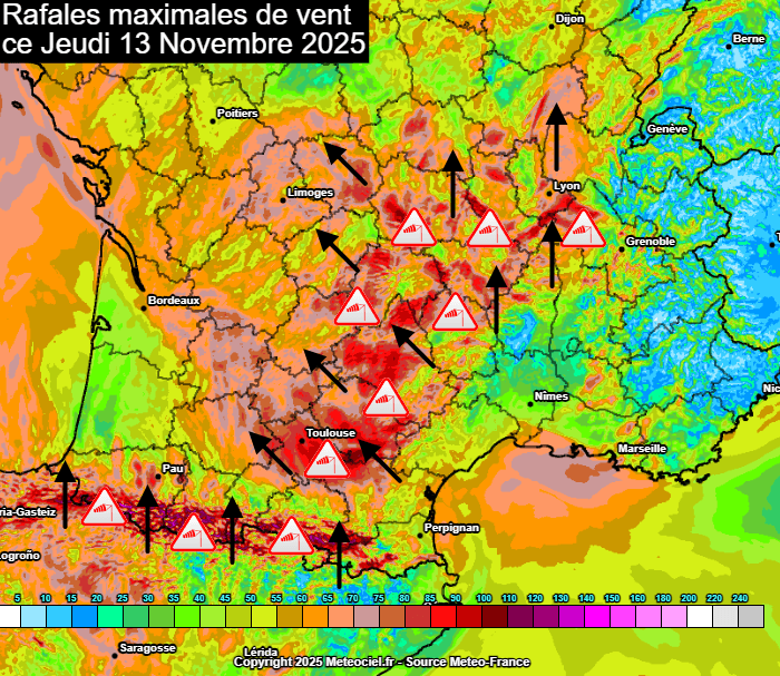 Le dynamisme du flux se juge également à la vitesse des vents. Non seulement le vent de sud souffle mais il souffle parfois très fortement. Ce jeudi 13 novembre 2025, le vent de sud dépassera les 100 km/h sur les crêtes pyrénéennes, contribuant à entretenir l'effet de foehn avec de nouvelles températures remarquables au pied des montagnes. Par ailleurs, des rafales de 100 km/h sont aussi prévues dans le domaine de l'autan (vers la Montagne Noire) et le vent de sud va aussi souffler très fort au centre-avec des pointes de 80-90 km/h pour le sud du Lyonnais.