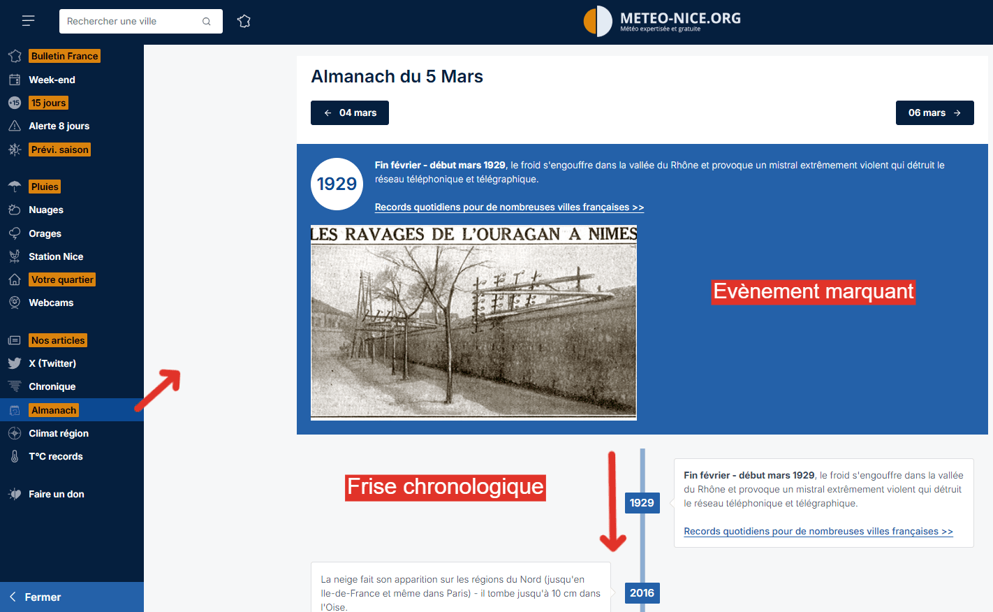 En parlant d'atout, connaissez vous notre Chronique meteo depuis 1850 et notre Almanach ? Cette base de données unique en France sur internet est particulièrement détaillée et mise à jour tout au long de l'année. Si vous souhaitez vous replonger dans le temps français du passé ou même simplement savoir quel événement météo a pu marquer l'actualité à votre date d'anniversaire, vous trouverez toutes vos réponses dans cette base de données, qui a d'ailleurs également pu servir pour un certain nombre d'ouvrages et d'articles liés à la météo et au climat français tant celle-ci est complète.