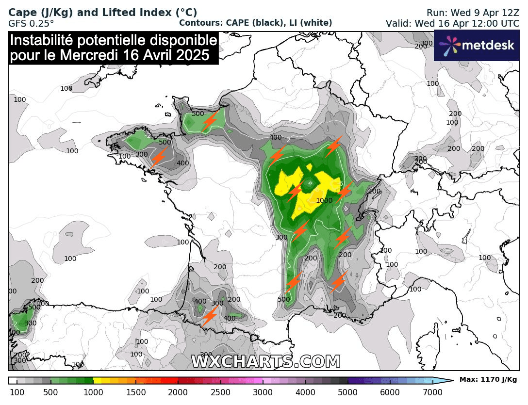 Instabilité potentielle disponible pour le mercredi 16 avril 2025 - wxcharts.com