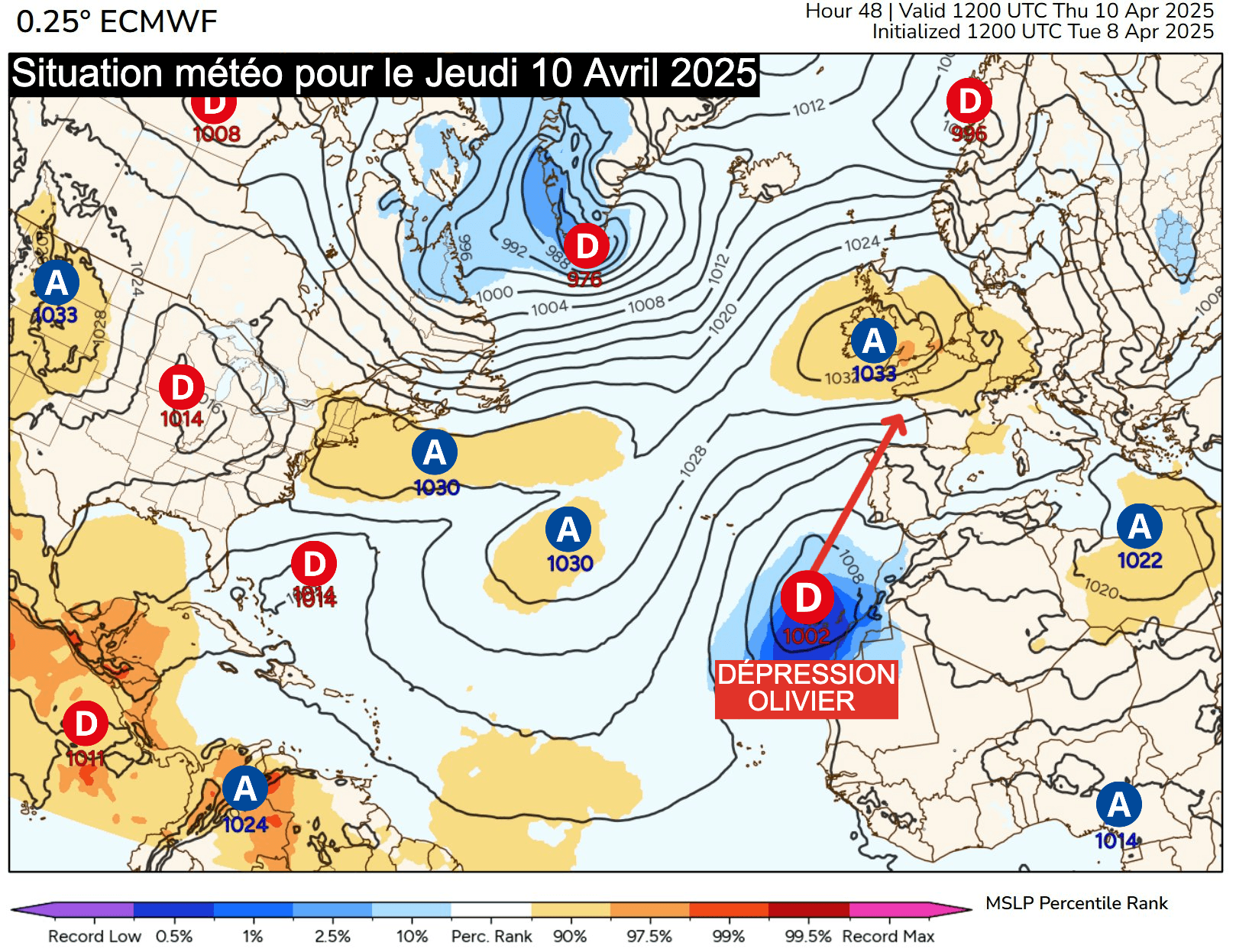 Situation météo au jeudi 10 avril 2025 avec la dépression Olivier au large du Maroc - PolarWx