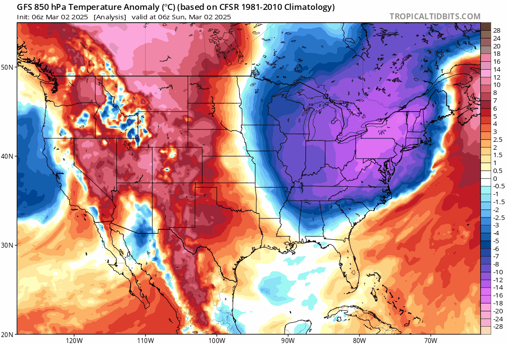 Anomalie thermique de la masse d'air vers 1500m du dimanche 2 au jeudi 6 mars 2025 - tropicaltidbits.com