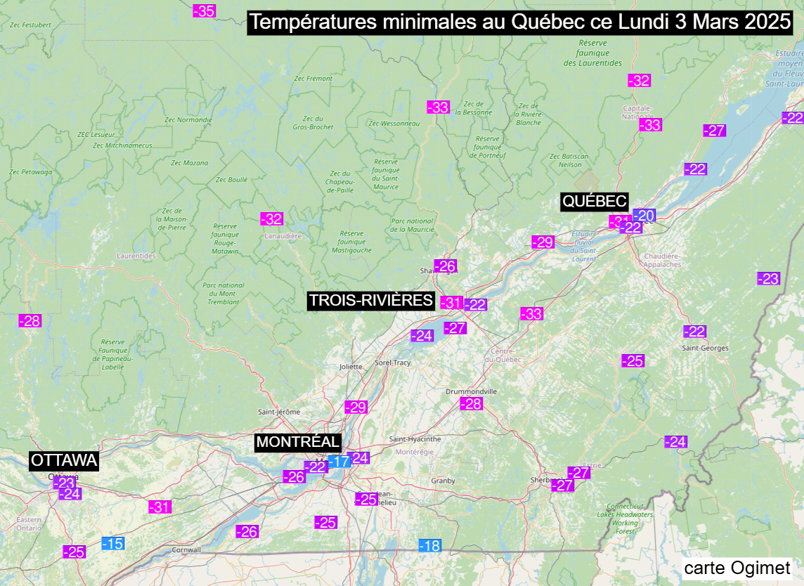 Températures minimales au Québec ce lundi 3 mars 2025 - Ogimet