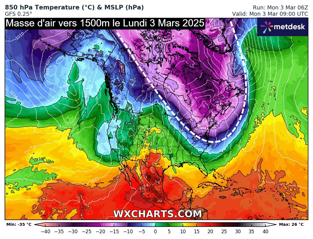 En ce début du mois de mars 2025 - et donc du printemps météorologique - le nord-est de l'Amérique vit des conditions drastiquement opposées à celles que connaît la France. En effet, un important décrochage polaire s'est produit ces derniers jours, envahissant tout l'est du Canada et les états du nord-est des USA. La température de la masse d'air vers 1500 mètres plonge entre -20 et -30°C, des niveaux se situant 10 à 15°C en dessous des moyennes saisonnières.