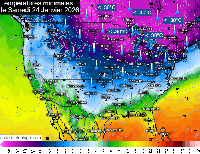 Le froid polaire s'installe pour ce week-end des 24 et 25 janvier 2026 dans tous le nord, le centre et l'est des USA. Dans les États du nord - frontaliers du Canada - les températures passent sous la barre des -30°C sous abri et le ressenti au vent peut atteindre localement -40 à -50 ! Ce froid glacial concerne aussi le centre et l'est du Canada où le thermomètre plonge entre -30 et -35°C avec des pointes de -40°C dans le Saskatchewan ! Les -15°C seront atteints jusque dans le centre des USA et dans l'État de New York.