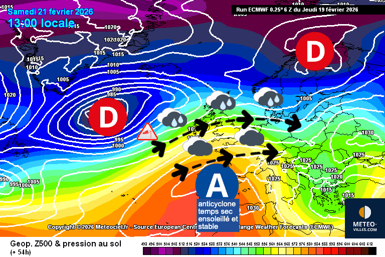 Le grand retour de l'anticyclone des Açores sur le sud-ouest de l'Europe ce week-end ! Carte de prévisions ECMWF pour samedi 21 février 2026