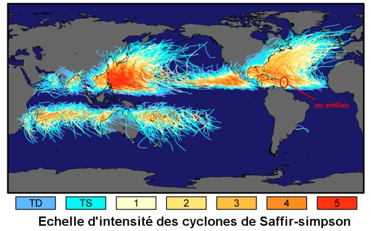 Trajectoires et intensités des cyclones entre 1985 et 2005 - via Wikipédia