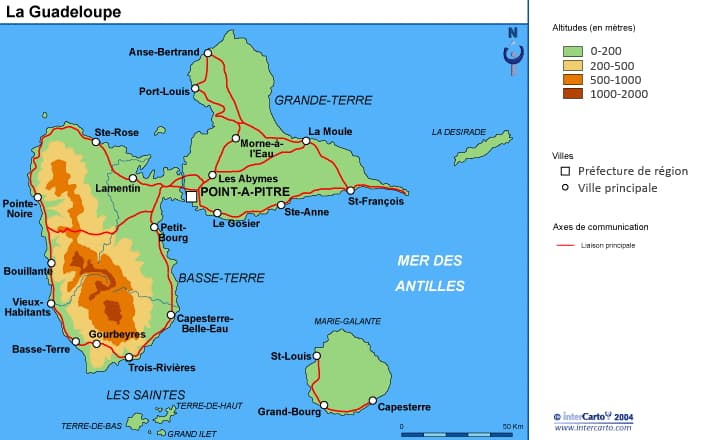Grande-Terre est une île plate sans relief. Son point culminant n'est qu'à 136 mètres du niveau de la mer. En revanche, Basse-Terre est nettement plus montagneuse mais aussi recouverte d'une forêt tropicale dense avec de nombreuses rivières et cascades. Le point culminant de l'île est le fameux volcan de la Soufrière - toujours en activité - et qui culmine à 1.467 mètres. Notons qu'à proximité de Basse-Terre et de Grande-Terre se trouvent les petites îles des Saintes, de la Désirade et de Marie-Galante.