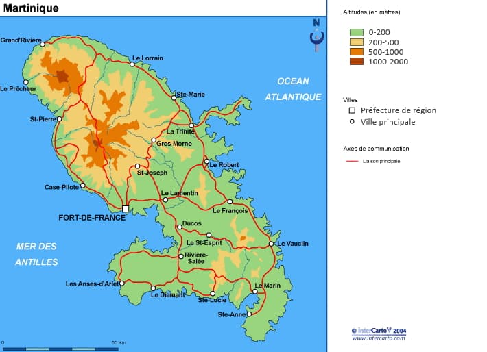 La Martinique est située plus au sud de la Guadeloupe (la Dominique se trouvant entre les deux). Il s'agit d'une île d'une superficie de 1.128 kilomètres. Comme pour la Guadeloupe, on constate deux parties à la géographie différente. Le sud de la Martinique est relativement plat. Le point culminant de la partie sud de l'île est la montagne du Vauclin à 504 mètres d'altitude.