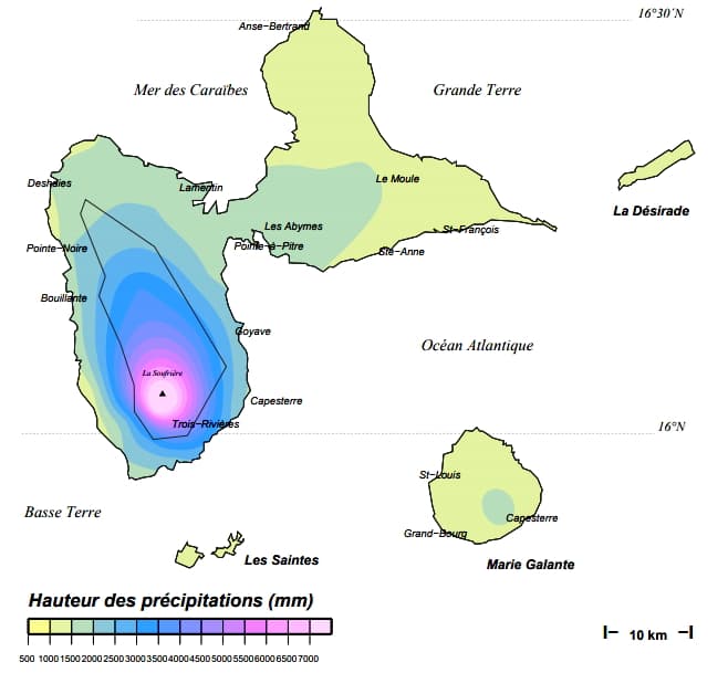 Le caractère plus montagneux de Basse-Terre lui vaut une pluviométrie largement supérieure à celle de sa voisine car les nuages ont tendance à s'accrocher sur les reliefs et précipiter davantage. Ainsi, les trois quarts de Basse-Terre reçoivent plus de 2.000 mm à l'année mais les cumuls sont vraiment impressionnants sur le relief du sud de l'île avec plus de 5.000 mm et même plus de 10.000 mm sur les pentes de la Soufrière ! À titre de comparaison, il ne tombe que 637 mm par an à Paris.