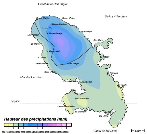 En revanche, la partie nord de la Martinique et son relief subissent des précipitations nettement plus abondantes. S'il tombe autour de 1.500 mm par an sur la plaine occidentale, on relève plutôt entre 2.000 et 4.000 mm sur une vaste zone intérieure de l'île avec des cumuls atteignant 5.000 mm en direction de la Montagne Pelée.