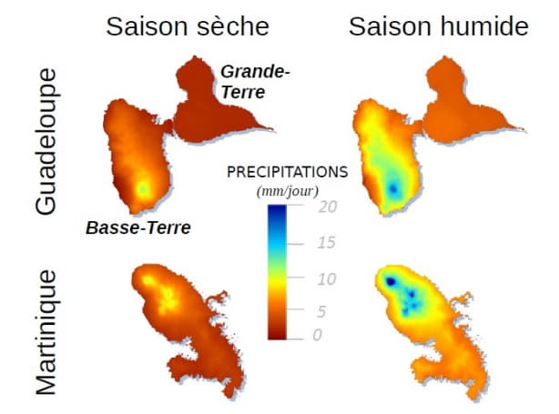 Aux Antilles, il existe une saison sèche et une saison humide. Ces saisons caractérisent le climat tropical qui concerne ces îles. La saison humide s'étire surtout de juin à novembre et une saison plus sèche suit entre décembre et mai. Que ce soit en Guadeloupe ou en Martinique, la distribution des pluies est géographiquement la même au cours de ces deux saisons mais les quantités et la fréquence varient, généralement du simple au double.