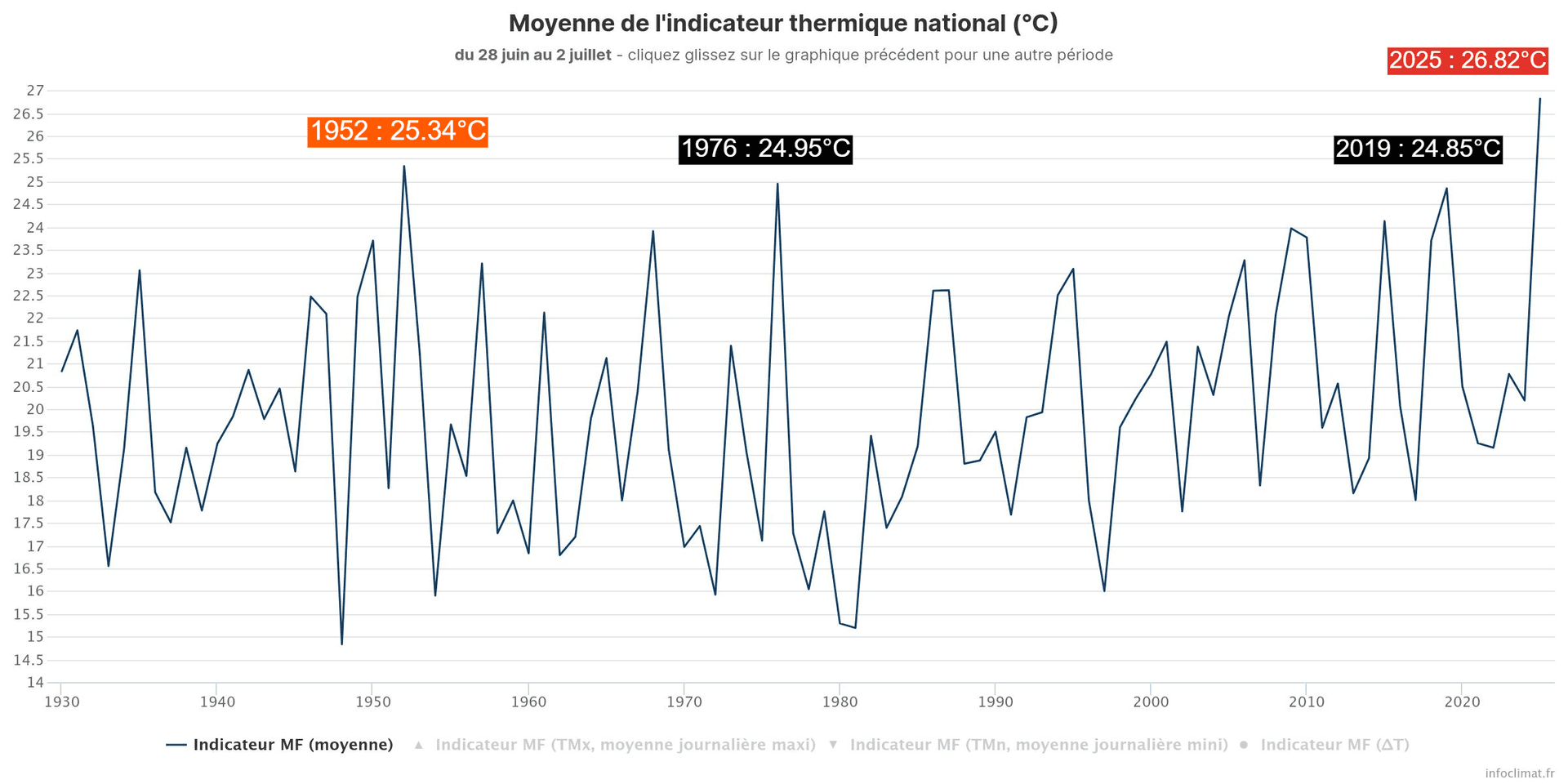 En effet, les prévisions de l'indicateur thermique national moyen pour cette période indiquent que nous dépasseront l'ancien record détenu par la période du 28 juin au 2 juillet 1952, 1976 et 2019, qui avaient pourtant observé des canicules particulièrement intenses sur notre pays. Il conviendra bien sûr de confirmer ceci à la fin de cette période caniculaire.