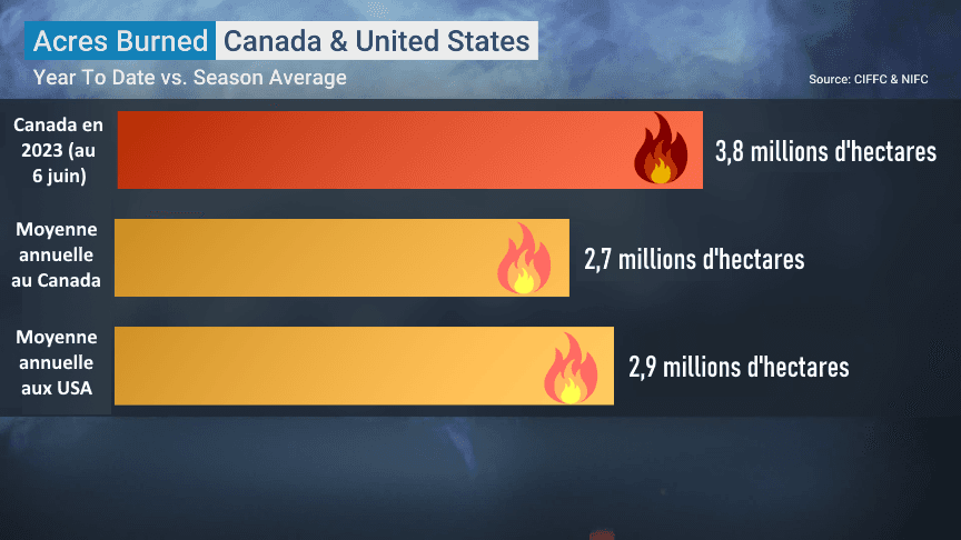 Le graphique ci-dessous permet de prendre la mesure de l'ampleur de ces incendies. En date du 6 juin 2023, ce sont près de 3,8 millions d'hectares qui avaient déjà été détruits par les flammes sur l'ensemble du Canada. À titre de comparaison, la moyenne annuelle du pays est de 2,7 millions d'hectares. Autrement dit, celle-ci a déjà été largement dépassée alors qu'il reste près de 7 mois à l'année 2023... Même la moyenne annuelle d'hectares brûlés aux États-Unis (2,9 millions) est allègrement dépassée...