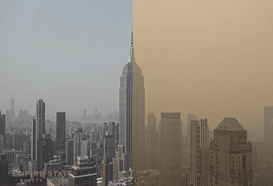 Comparaison entre le 6 et le 7 juin 2023 à New York avec l'arrivée de la fumée des incendies – webcam EarthCam