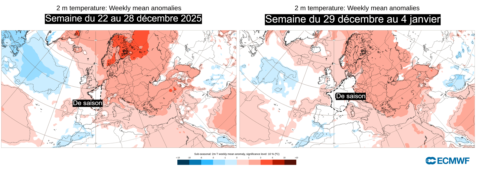 Anomalies de températures sur l'Europe du 22 décembre au 4 janvier – ECMWF