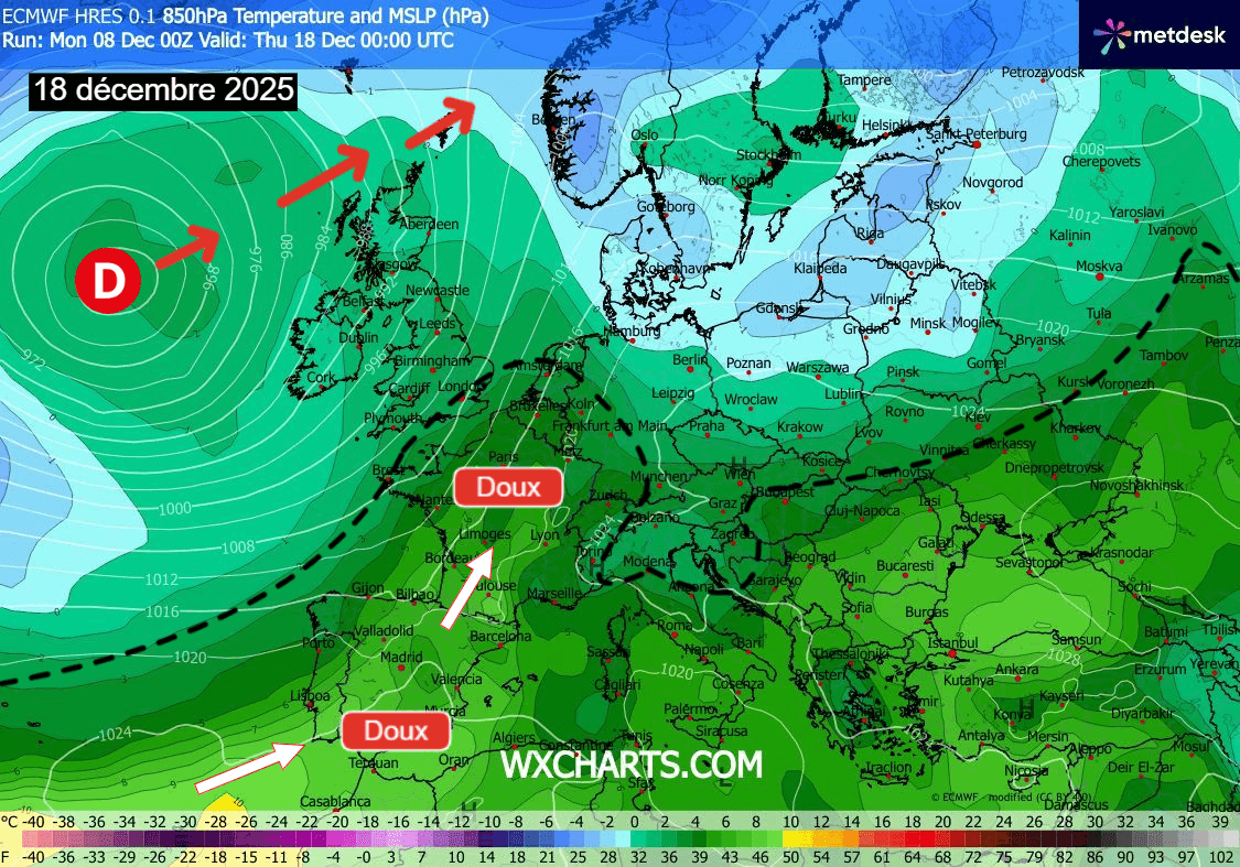 Il faudrait ainsi attendre la semaine suivante pour voir cette douceur s'estomper sur la France d'après les dernières modélisations avec des températures se rapprochant de nouveau des normales de la période, une tendance qui s'affirmerait d'ailleurs à la fin du mois de décembre et au début du mois de janvier 2026.