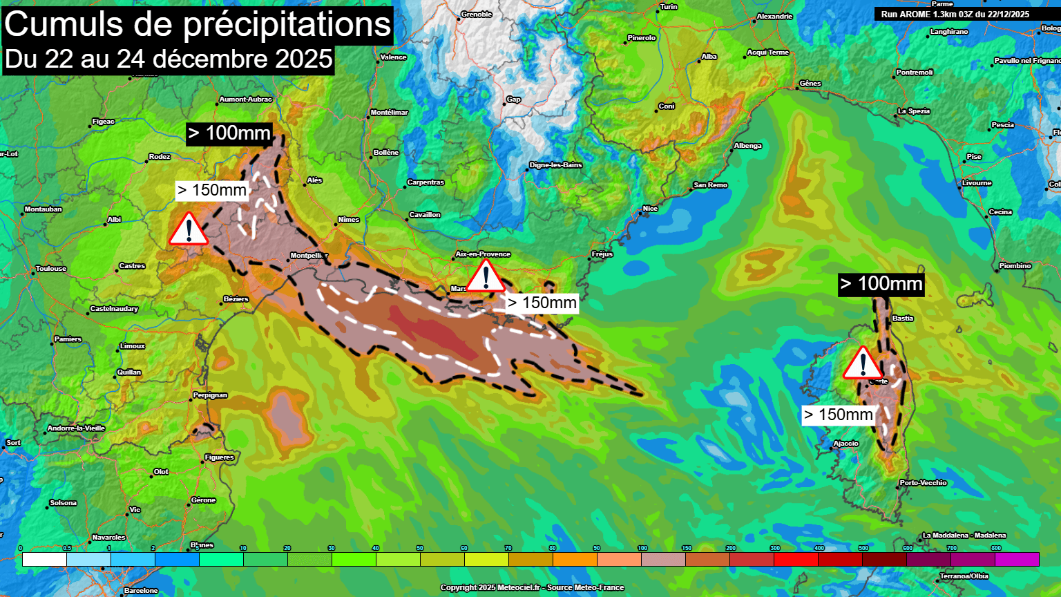 Cumuls de précipitations attendus sur le sud-est de la France jusqu'au mercredi 24 décembre 2025 – Arome via meteociel.fr