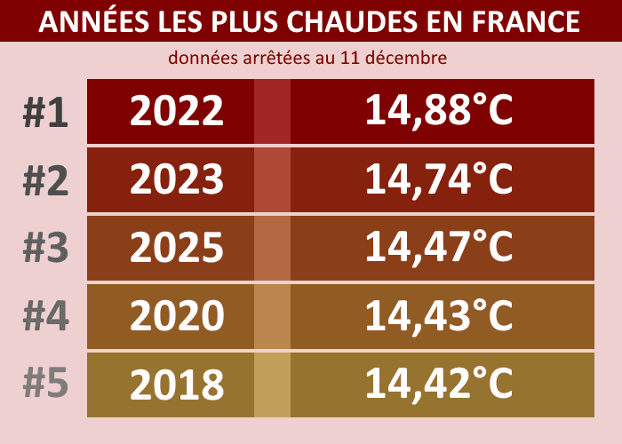 Si l'on ne prend en compte que la période allant du 1er janvier au 11 décembre, la température moyenne en France est de 14,47°C en 2025, se classant au troisième rang des plus chaudes, derrière les 14,74°C de 2023 et les 14,88°C de 2022. Ces deux années ayant connu une fin décembre remarquablement douce, il semble quasi-impossible que 2025 puisse les détrôner. Elle devrait se classer au troisième ou au quatrième rang des plus chaudes en France, rivalisant avec 2020 qui avait également connu une fin décembre très douce.