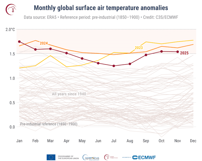 Sur la période allant de janvier à novembre 2025, l'anomalie thermique sur Terre atteint +1,48°C par rapport à l'ère pré-industrielle (1850-1900) ! Ce chiffre est très proche de l'objectif des accords de Paris sur le climat, adopté fin 2015, qui visaient à limiter le réchauffement à +1,5°C. Cette anomalie est semblable à celle enregistrée durant l'année 2023 mais reste derrière celle de 2024, qui était devenue la première année à dépasser la barre symbolique des +1,5°C avec une anomalie mondiale sur 12 mois de +1,55°C.