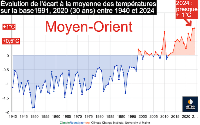 Évolution la température (écarts à la moyenne 1991-2020) depuis 1940 au Moyen-Orient - ClimateReanalyzer.org