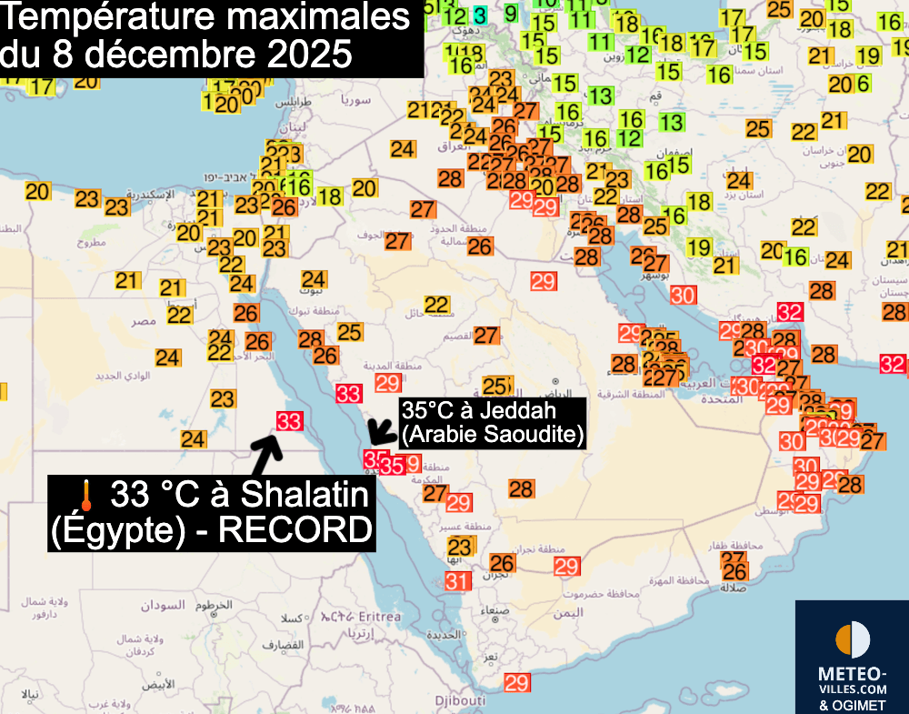 Ces derniers jours, les records de température tombent à un rythme effréné : Shalatin, en Égypte, a enregistré un record absolu pour un mois de décembre avec 33 °C lundi 8 décembre, tandis qu’Abou Simbel a établi un nouveau record mensuel à 32,8 °C vendredi 5 décembre. Il a fait aussi jusqu'à 35°C à Jeddah, en Arabie Saoudite.