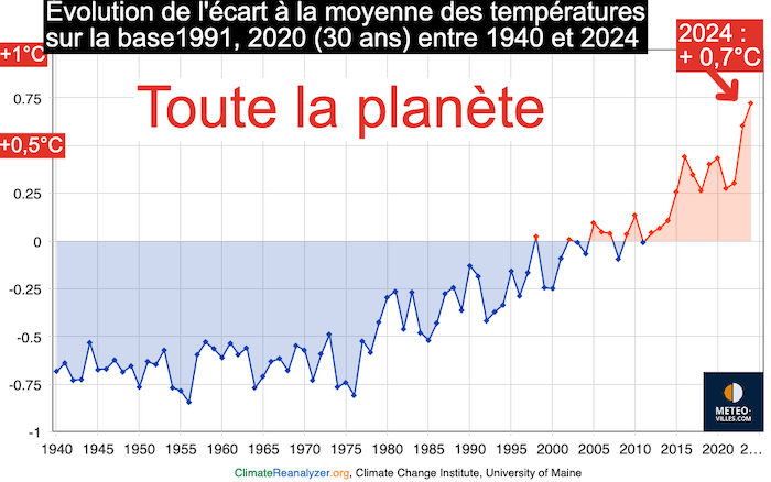 Évolution la température (écarts à la moyenne 1991-2020) depuis 1940 sur l'ensemble de la planète - ClimateReanalyzer.org