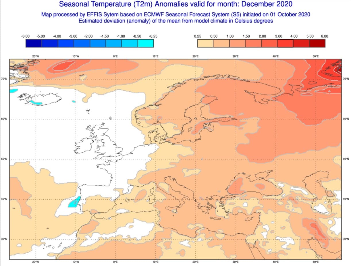 Anomalies de températures par rapport aux normales de saison sur l'Ouest de l'Europe durant le mois de Décembre 2020 - Modèle Européen ECMWF