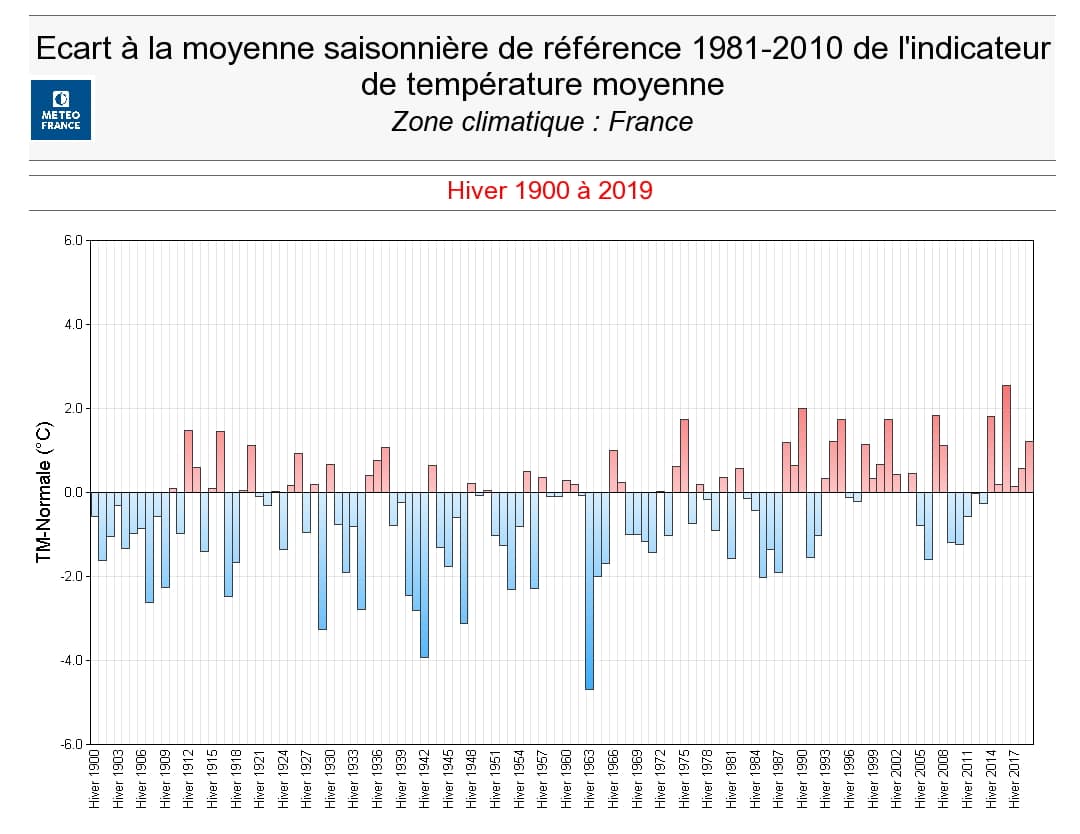 7 des 10 hivers les plus doux en France depuis 1900 ont eu lieu au cours des 30 dernières années. 2 des hivers les plus doux jamais enregistrés se sont produits entre 2015 et 2020.